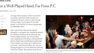 Today, The New York Times Style section published a nice little puff piece about Temkin and his game with no mention of the accusation. It focuses on Cards' success with young, hip New Yorkers and Temkin's charmingly edgy persona. It does not point out the painfully recent kerfuffle in the gaming community over the alleged sexual assault and Temkin's pat, unapologetic response to the accusation.