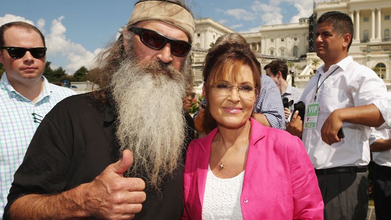 What’s worse than getting your leg peed on and being told it’s raining? Getting your leg peed on and being told that it’s Palin. At least, that’s how it feels after reading PEOPLE’s report that the hip-hop rappin’ former governor of Alaska Sarah Palin (pictured above with another human whose politics are as garbage as his TV) has her eyes set on becoming a TV judge. Says PEOPLE: