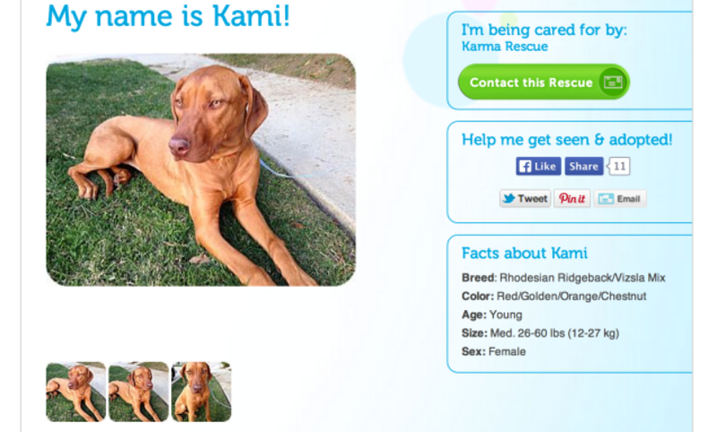 A cached version of Karma Rescue's adoption bulletin for Raffiki—or "Kami"—is still accessible online. "I am already spayed, housetrained, up to date with shots, good with kids, and good with dogs," it says. "I'm a really sweet girl who loves to have fun so if you think you're the right match for me, please ask to meet me!"
