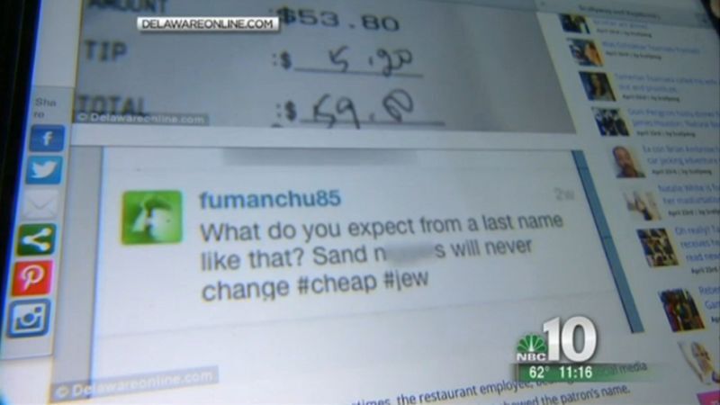 At least two other customers were treated to similar insults for leaving what the restaurant apparently deemed too small a tip.