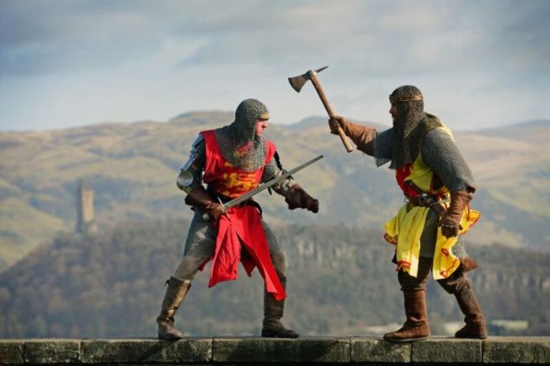 [Roy Ramsay dressed as King Robert the Bruce and Roy Murray dressed as Edward II promote Bannockburn Live on Wednesday in Stirling, Scotland. The event being held on June 28 and 29 to commemorate the 700th anniversary of the Battle of Bannockburn. Image via Jeff J Mitchell/Getty Images.]