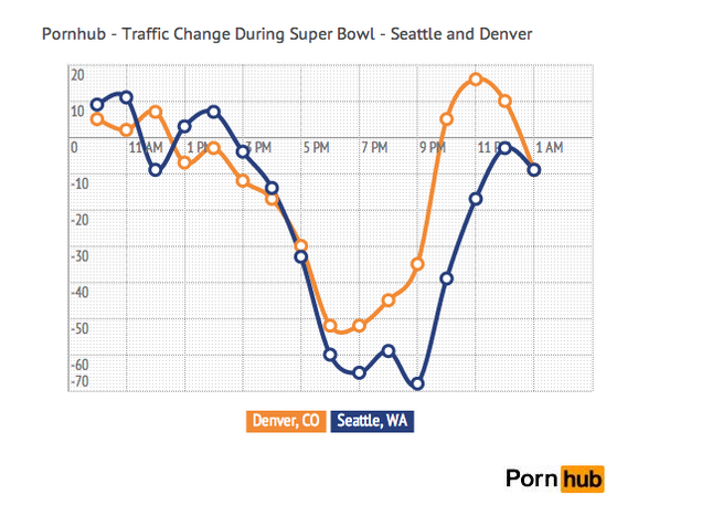 The excitement leading up to the Super Bowl also led to a noticeable drop, with 11% and 18% decreases in Denver and Seattle and a six percent drop across the country. That's a lot less porn!