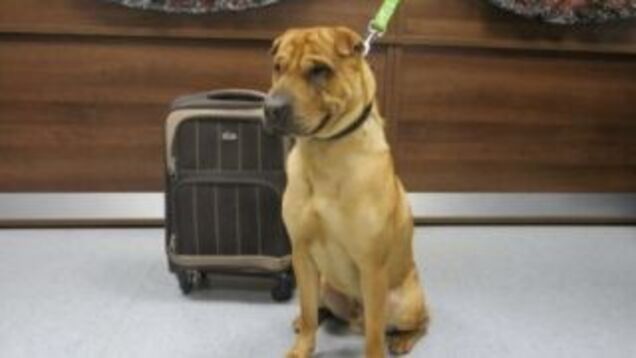 An adorable, sad little Shar-pei mix named Kai was found tied to a railing inside a Scottish train station last Friday, along with a suitcase packed with all his worldly possessions: A pillow, a toy, and a food bowl with some food. The Scottish Society for the Prevention of Cruelty to Animals is searching for the owner who abandoned him.
