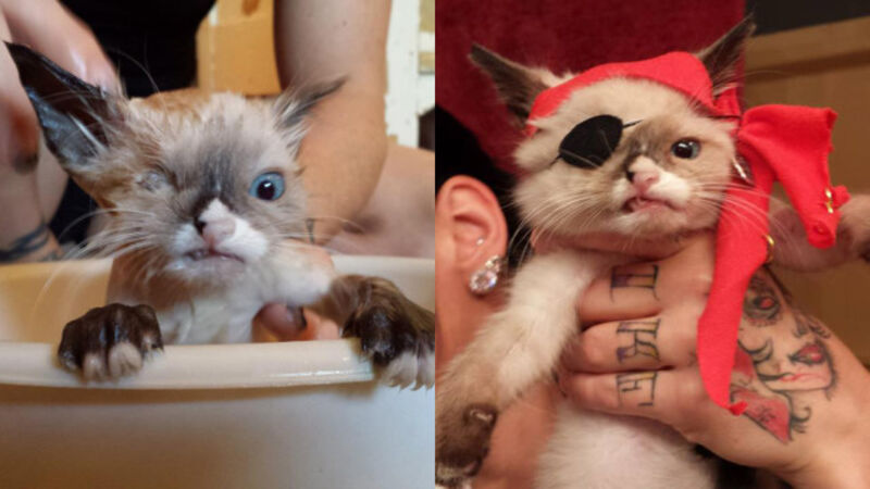 But then a nice Portland-area foster woman named Blazer Schaffer took in the three kittens and created a Facebook fan page for Sir Stuffington. Why him? Because he's a legendary cat pirate! Now he is quickly becoming the most famous one-eyed cat in today's Facebook-share history. You can see why here: These photos are ridiculous.