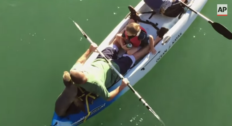 In a video posted by the Associated Press, we see one, two, three, four—wait, that fourth guy isn't a human. That's a sea lion. You are not human, man. Get out of here. What is this, some kind of joke?