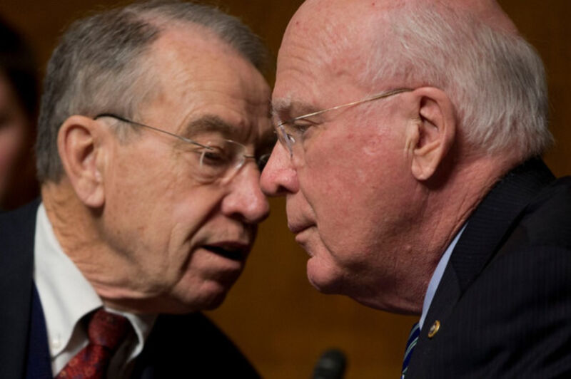 [Senate Judiciary Committee Chairman Sen. Patrick Leahy, right, listens to Committee Ranking Member Sen. Chuck Grassley on Capitol Hill in Washington on Tuesday during the committee's hearing on data breaches and combating cybercrime. Image via Pablo Martinez Monsivais/AP.]