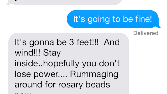 We'd like to read all the texts and emails your moms have sent you about disaster preparedness in the last 24 hours—please post them in the comments below. For starters, here are the loving reminders that Gawker Media staffers have received so far. From basic inquiries: