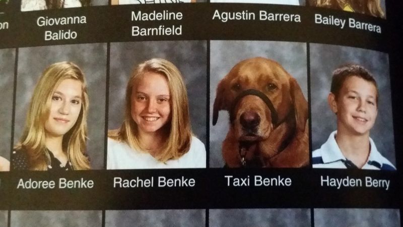 The photo is especially meaningful to the Benkes because the school district hasn't always been supportive. When Rachel was elementary school, the principal considered Taxi a distraction, and her mom had to file a complaint to keep the dog there.