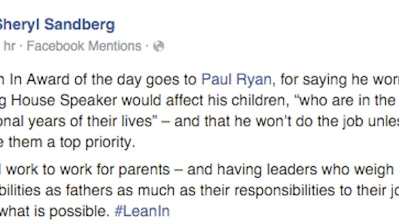 Facebook COO and perpetual self-promotion machine Sheryl Sandberg has picked an odd choice for today’s “Lean In Award,” an imaginary honor she presents via Facebook: Paul Ryan. The same Paul Ryan who opposes, over and over again, workplace equality for women.
