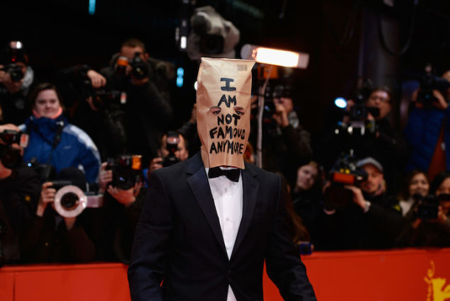 That is Shia LaBeouf at the German permiere of Lars von Trier's new film Nymphomaniac wearing a brown bag over his head that says "I AM NOT FAMOUS ANYMORE," a slogan he debuted on Twitter about a month ago. There is also a bar code at the top right corner of the bag, because being a multimillionaire actor makes you feel like a product or whatever.
