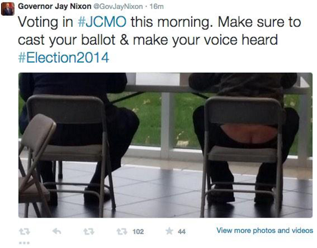 KCTV reports that a member of the governor's staff was responsible for tweeting this photo depicting Nixon casting his vote. The staffer apparently did not notice Nixon was voting alongside a woman and her very visible butt crack. The tweet was quickly deleted, but Nixon definitely made his voice heard.