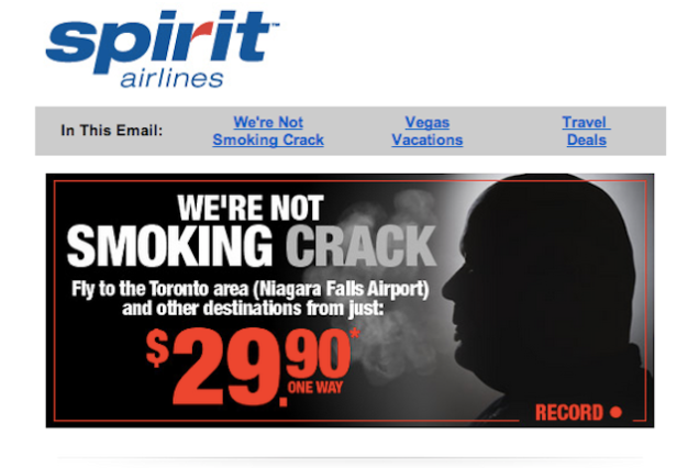 Spirit Airlines, the absolute shittiest airline operating in America, according to me, is marking Toronto Mayor Rob Ford's downward spiral by offering cheap flights to the Toronto area via a special deal. The tagline, from an email blast just sent to customers: "We're not smoking crack." That sure is a cheap flight, but, again, do not fly Spirit Airlines—it is a goddamn nightmare.
