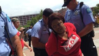 As prominent Black Lives Matter activists, including DeRay McKesson, Johnetta Elzie, and Cornel West, were being arrested outside the St. Louis federal courthouse, the executive of St. Louis County declared an emergency in Ferguson. The St. Louis County police department, who last night exchanged gunfire with and wounded an alleged gunman, will now take over all policing in Ferguson.