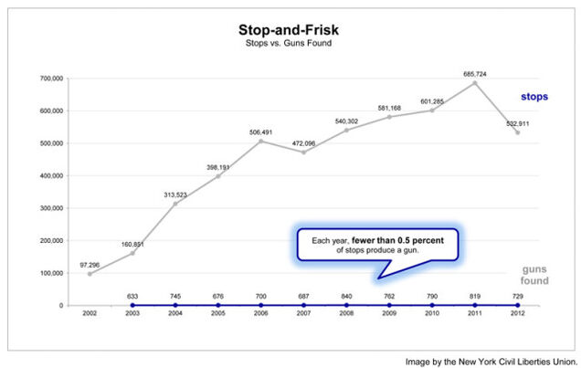 To put that gun recovery figure in perspective: "In 2003, when 160,851 stops were conducted, 633 guns were recovered, while the 532,911 stops in 2012 resulted in 729 recovered guns." In other words, the NYPD stopped and frisked an additional 370,000 people— 90% of them innocent— in order to recover an additional 96 guns. That is an abysmal failure rate by any standard.