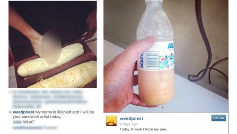 One of the photos shows a person placing his genitals on Subway's familiar bread loaf; the other shows a bottle of urine which was allegedly frozen "at work."