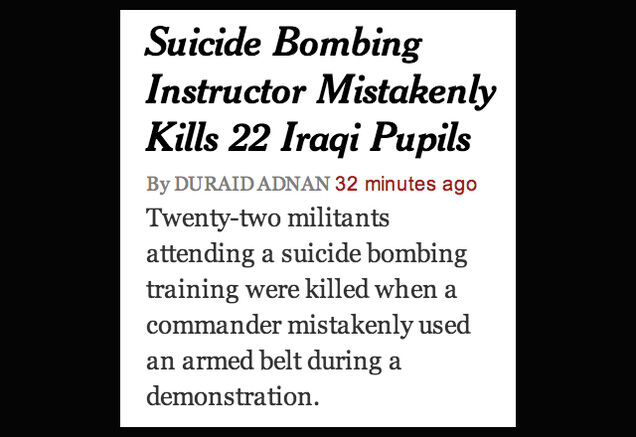 Perhaps it was really a lesson on Beckett-like absurdism in our modern political culture. Perhaps it was just a moronic dipshit with 1.5 brain cells and a Radio Shack catalog. Whatever the explanation, the accidental boom in a suicide-bombing class made for good copy in today's Times: