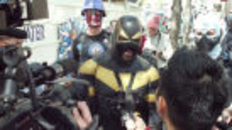Phoenix Jones is an idiot weirdo from Seattle who dresses up in a superhero costume and gets his nose broken. Last year he spent May Day pepper-spraying protestors outside city hall, because that's what Batman would've done (superhero? More like superstructure! Or something); this year, he took to the streets of Seattle during the city's May Day protests, ready to beat some anarchist face. At 5th and Jackson, he met his match: