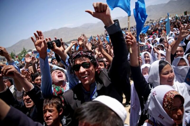 Supporters of Afghan presidential candidate Abdullah Abdullah cheer during a campaign rally in Jaghuri district in Ghazni province, Afghanistan, on Thursday. The second round of the presidential election will take place on June 14. Image via Massoud Hossaini/AP.