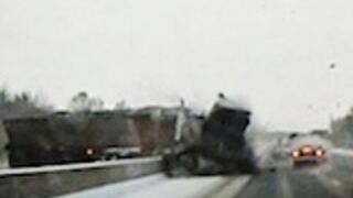 Thank goodness driver Matthew Krizsan's camera was on when a truck hauling sand jackknifed through a highway divider and almost slammed into him! Otherwise we might not have this amazing video. Oh, and, also, thank goodness he survived.