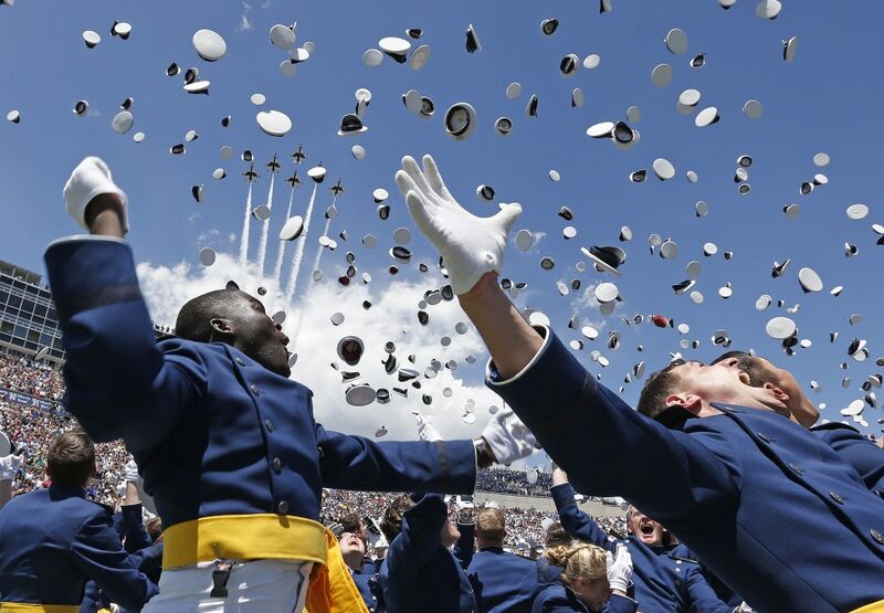 Sarah Hedgecock5/29/14 10:23am341EditPromoteDismissUndismissHideGo to permalinkAir Force Academy graduates throw their caps into the air as F-16 jets from the Thunderbirds make a flyover at the completion of the graduation ceremony at the U.S. Air Force Academy in Colorado on Wednesday. Image via Brennan Linsley/AP.