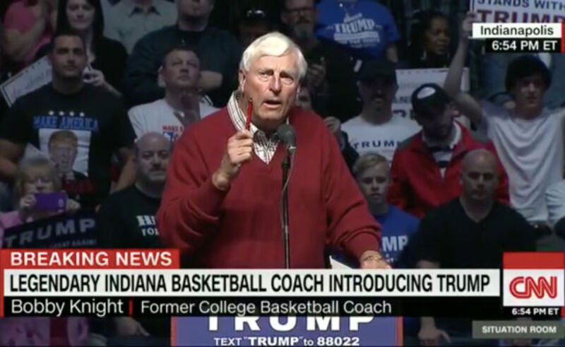 At a campaign rally in Indianapolis on Wednesday, famously furious basketball coach Bobby Knight endorsed famously furiouser basketball Donald Trump, saying he will be one of the “best presidents in U.S. history.”