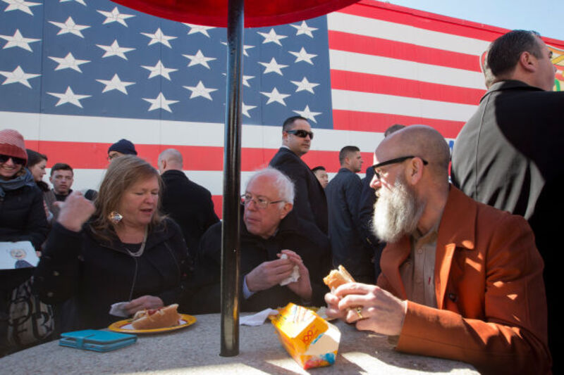 As The New York Times has it, Bernie Sanders spent his Sunday chowing on sauerkraut-smothered Nathan’s hot dogs and mingling with constituents at a rally on Coney Island, accompanied by both his loving wife and Rock Guy Michael Stipe.