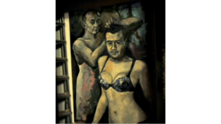 Russian authorities seized this painting, showing Russian President Vladimir Putin and Prime Minister Dmitry Medvedev in ladies' lingerie, from a St. Petersburg art gallery.