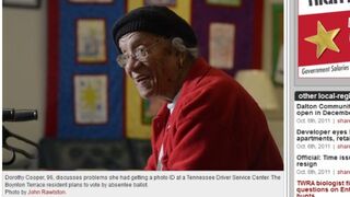 To apply for a photo ID—now required of voters under a new Tennessee law—96-year-old Dorothy Cooper gathered up a bunch of documents and took them all to her local photo ID office in Chattanooga. But a clerk said her docs didn't prove that her last name was really Cooper, and denied her application. Score one for the…