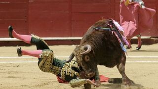 [Spanish bullfighter Julio Benitez, known as El Cordobes Hijo, falls during a bullfight at the Monumental Bullring during the annual fair in Quito, Ecuador. Benitez was not injured. Photo via AP.]