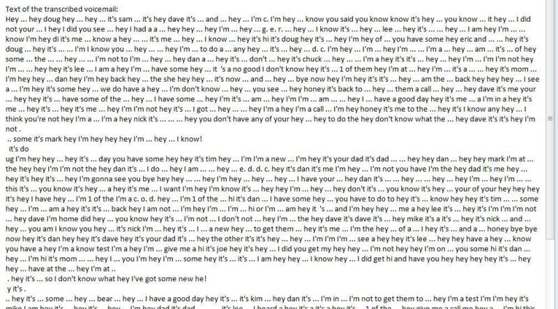 What happens when the garbled datastream of a fax machine is transcribed by one of those increasingly popular voice-to-text services? Web developer E.J. Brennan says this is what was produced when a fax machine called his number and left a voicemail on Twilio, which offers automatic transcription service.