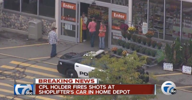 A woman with a gun and a concealed-carry license opened fire on a shoplifter Tuesday afternoon as security chased the man out of an Auburn Hills, Mich. Home Depot, the Detroit Free Press reports. No one appeared to be injured, and the shooter is cooperating with police.