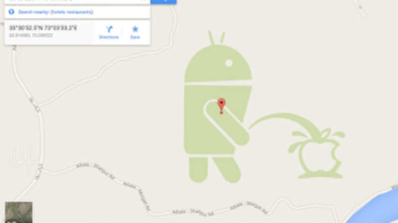 Navigate to 33°30’52.5”N 73°03’33.2”E in Google Maps this morning—a rural area south of Rawalpindi in Punjab, Pakistan—and you’ll find an oddly shaped park. Just like Calvin pees on the Chevy logo on the backs of countless Ford trucks, there’s Google’s Android logo taking a leak on Apple. Who put it there?