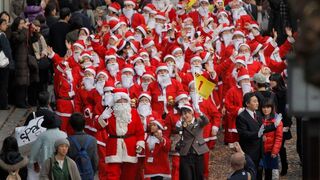 [A vicious gang of Toy Store Kiddy Land Santa Claus Academy students march through Tokyo. Photo via AP.]