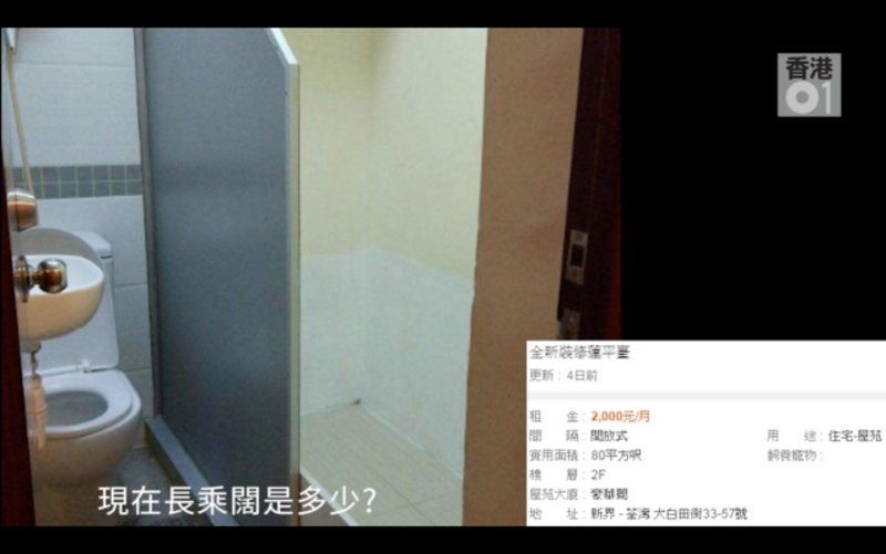 Hong Kong news magazine HK01 recently toured a 30-square-foot “toilet subdivided room” (廁所劏房) renting for 2000 HKD a month (around $250). Reporters responded to a listing at a rundown low-rise building in the city’s Kwai Chung district and found this.
