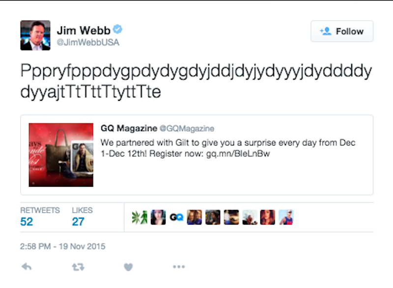 Jim Webb Just Can't Contain His Holiday Cheer, Now Tweeting in Squees of Delight