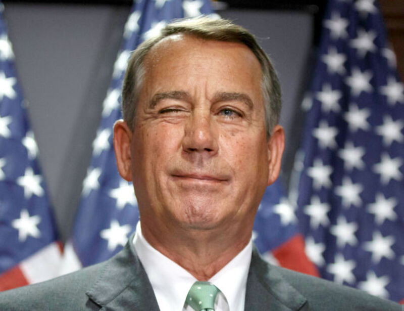 House Speaker John Boehner winks at Politico's Jake Sherman at the Republican National Committee headquarters in Washington, Tuesday. Sherman had asked Boehner whether had ideas for border legislation. "I've got lots of them," Boehner said. Image by J. Scott Applewhite via AP.
