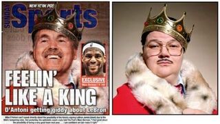 For their back cover today, the Post had Mike D'Antoni FEELIN' LIKE A KING over possibly luring LeBron James to New York. Except they photoshopped his head on the body of famed New York Drag King Murray Hill. Har har.