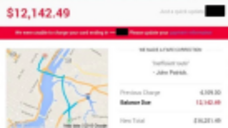 Gothamist reports on the harrowing tale of a woman who got in an Uber and took the “car ride from Hell” to get from Williamsburg to Midtown East, after which she had to dispute a $12,000 bill for her trouble. Sure, surge pricing was in effect, but she didn’t know it was going to be platinum surge pricing.