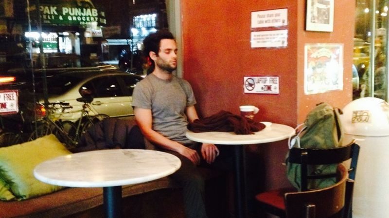 Hey there, Upper East Siders. Gawker here. Before you traipse off to slumber or a sex club tonight, please take a moment to appreciate this photo, submitted by tipster @AnimalFarmNYC, which allegedly depicts former NYU student and successful author Dan Humphrey "sleeping and/or meditating" at a Manhattan coffee shop…