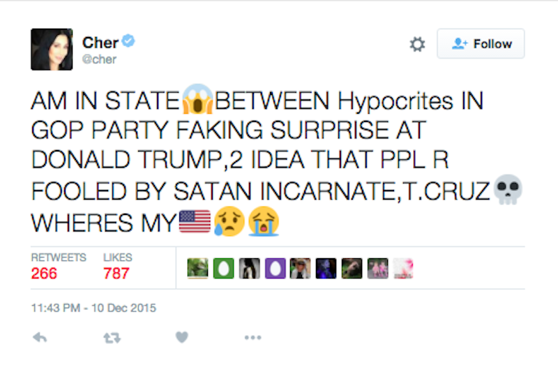 The Twitter of Cher, which consists mainly of a frantic jumbles of exclamation points and emojis, is always a joy to watch, and even more so when a presidential candidate is involved.
