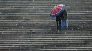 [A couple huddles under an umbrella during a storm on the steps to the Philadelphia Museum of Art. They might be kissing, but I'm hoping she's yelling at him for wearing a chain wallet. Pic via AP.]