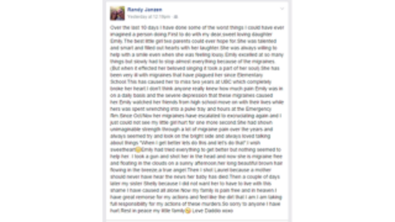 A British Columbia man has apparently admitted in a Facebook post to killing his family, CBC News reports. The post on Randy Janzen’s Facebook page states that he killed his wife, his daughter, and his sister.