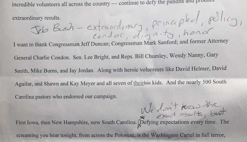 Here Are the Handwritten Edits to Ted Cruz's Victory Speech After He Lost South Carolina