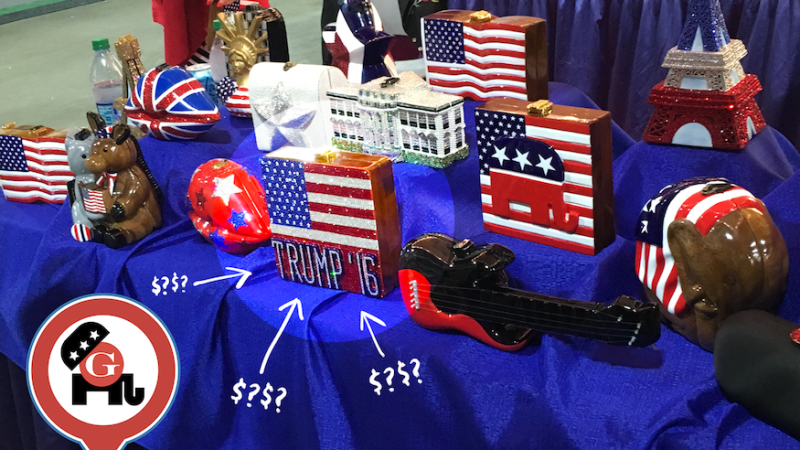 The Republican National Convention isn’t just about putting the GOP’s shiny new nominee on display. It’s also the perfect place for good, hard-working American vendors to hawk their wares. Wares like this rhinestone-covered box for Trump. Guess how much this box costs.