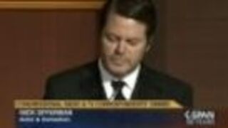Speaking at the Radio and Television Correspondents' Association Dinner Thursday night, headliner Nick Offerman—who plays anti-government government employee Ron Swanson on Parks and Recreation—took the assembled news media to school with a timely lecture on the Bill of Rights.