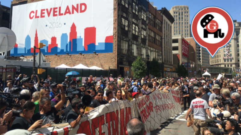 CLEVELAND — On Wednesday, a coalition of leftist groups, led by organizers from the Latinx group Mijente, raised a handmade wall—a series of long, spray-painted, cloth signs held aloft, stretching, in segments, several hundred (and maybe thousands) of feet across—in front of the Republican National Convention. This…