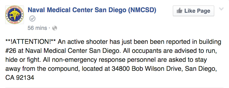 An active shooter situation was reported this morning at the San Diego Naval Medical Center, a military hospital in the city’s Balboa Park. However, no injuries were reported, and a Navy spokesman said that initial inspections of the facility found no sign of a shooting or gunman.