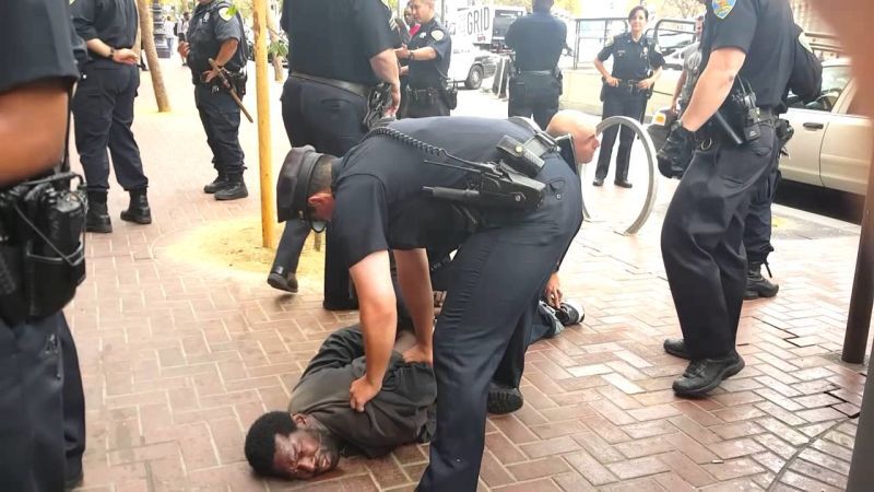 A handicapped, homeless man who made the mistake of arming himself with a pair of crutches paid dearly for his arrogance, courtesy of 14 San Francisco police officers who tackled him, pulled off his pants, and pinned him down on the ground for more than 10 minutes.