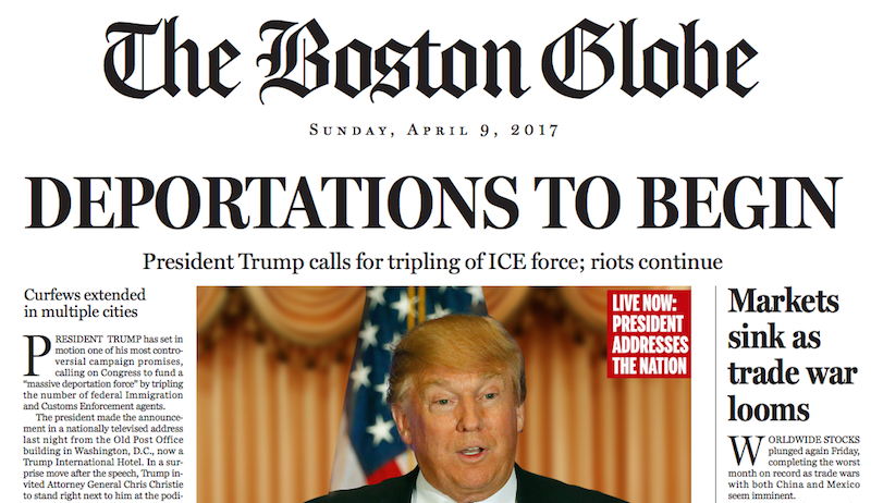 This weekend, after much fanfare, the Boston Globe published a satirical front page, dated a year in the future, imagining a the day-to-day reality of a Trump presidency. Speaking at a rally in Rochester, New York, on Sunday, Trump called the Globe “stupid” and “worthless.”