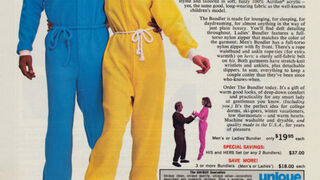 Robe scientists have discovered the earliest known Snuggie/ Slanket ancestor: "The Bundler." Which is apparently just footie pajamas held on with rubber bands? "Deliciously sexy on her, smoothly good-looking on him." No it's not. [Flickr via Copyranter. Click to enlarge.]